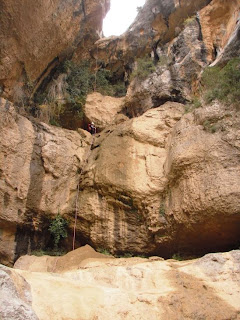 El primer rápel, con la primera marmita trampa, y la que más costó de pasar, esto no estaba en los libros...Estos son los rápeles más largos grabados en vídeo ;disfrutamos como enanos cuando bajábamos, no tanto cuando los vimos desde arriba...