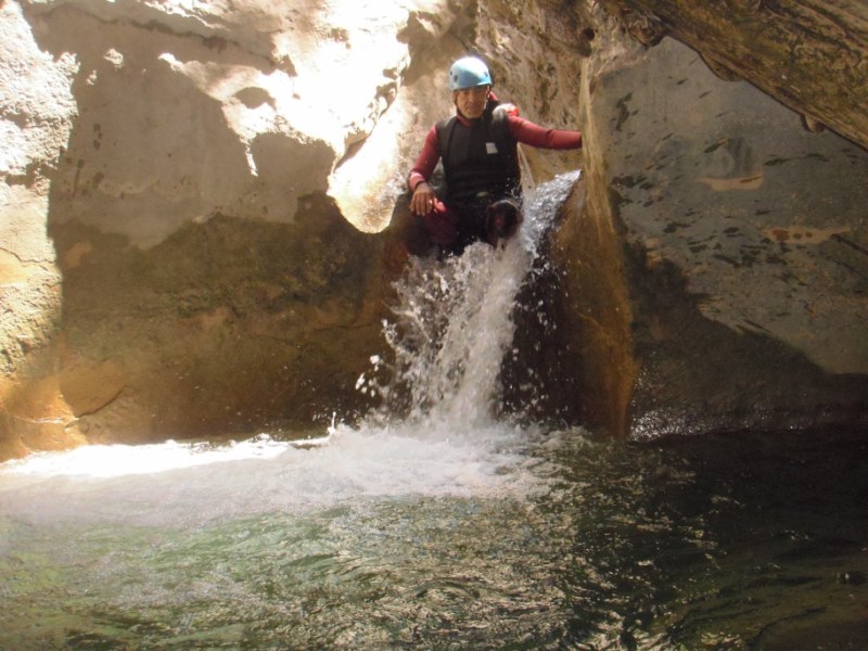 Antes de llegar a la poza Chinchirigoi, encontramos a la izquierda nuestro segundo objetivo del día: el Barranco de Sieste. A la izquierda de su término, sale una senda que nos lleva en 10 minutos a la cabecera. Aquí los rápeles son de 17 metros (volado), una rampa de 28 metros, y otro de 5 metros (evitable), y para terminar, un salto obligado de unos tres metros (algo delicado).