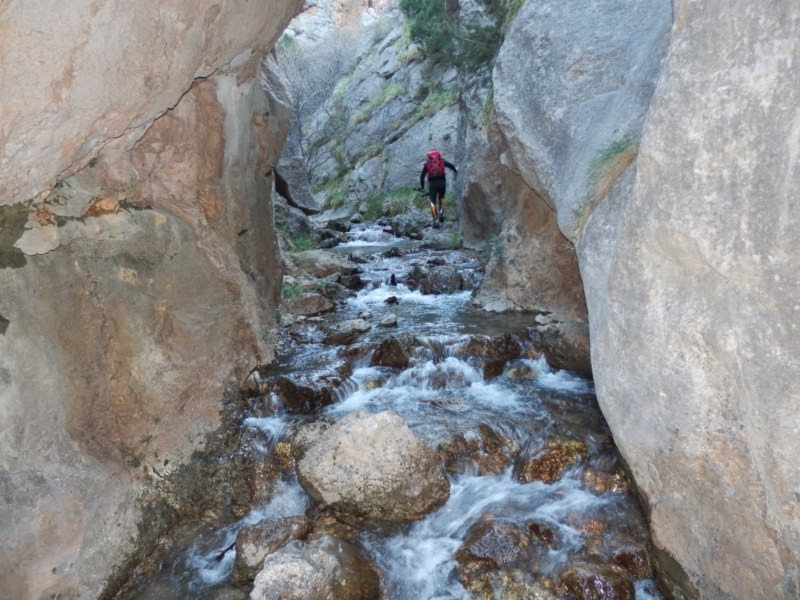 Poco a poco la cosa se va estrechando y tenemos que cruzar varias veces el cauce hasta que las paredes se cierran tanto que tenemos que ir literalmente por el cauce, que además hoy baja bien alegre. Hay piedras estratégicamente colocadas para no mojarse, pero hoy es inevitable hacerlo.
